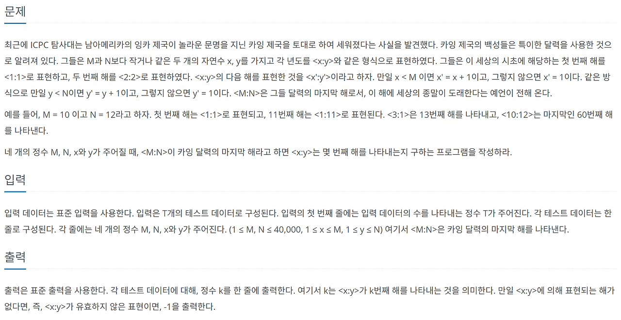 문제: m, n , x, y 를 입력한 후 < m,n > 달력에서 < x, y> 인 해가 몇번째인가??