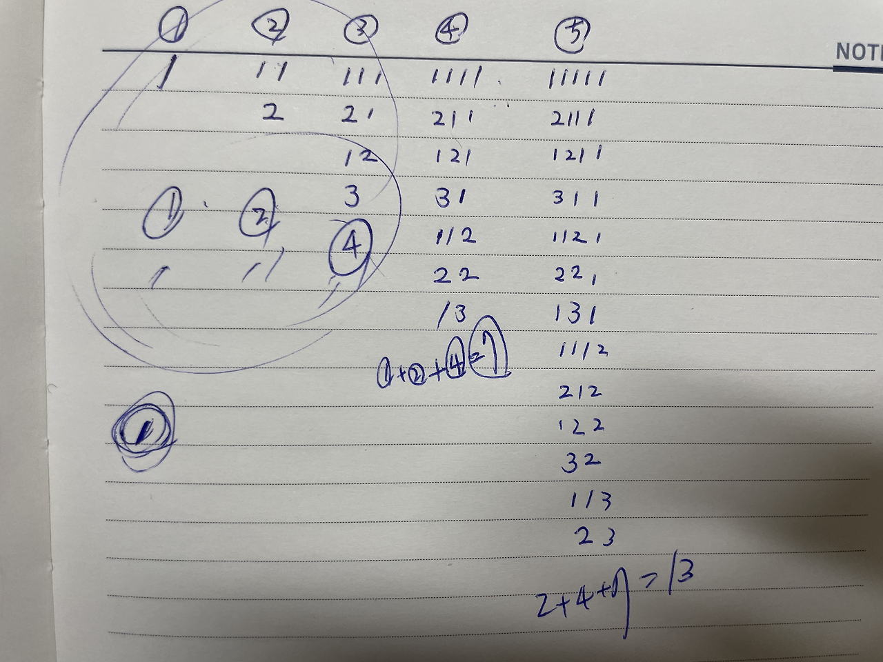 푸는방법을 들은 후 나의 문제점은 더 다양한 케이스에서 시도해 보지 않은것이다. 제일 작은 수부터 큰 수대로 나열한 후 지난 수에서의 합을 구해보지 않았다. 그저 내가 써내려간 n 수 하나하나의 경우의수를 어떻게 계산할 지만 고민했다. 앞으로 이렇게 나열된 수가 있는 알고리즘을 보면 점층적으로 각각 수들의 일정한 규칙을 찾아 볼 것이다.