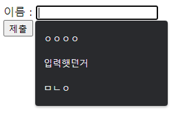 | datalist | 미리 지정된 값을 리스트 형식으로 불러오거나 보여준다 |