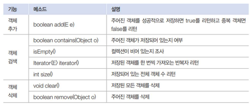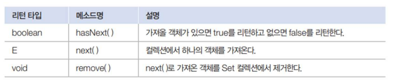 iterator() 메소드: 반복자를 얻어 Set 컬렉션의 객체를 하나씩 가져옴