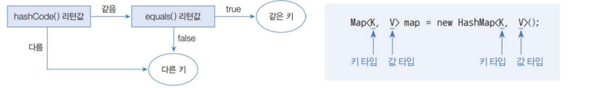 키로 사용할 객체가 hashCode() 메소드의 리턴값이 같고 equals() 메소드가 true를 리턴할 경우 동일 키로 보고 중복 저장을 허용하지 않음