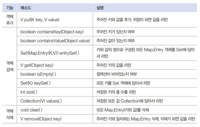 Map은 키와 값을 하나의 쌍으로 묶어서 관리하는 구조(List, Set과는 사용방법이 다르다)