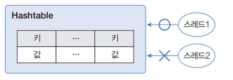 동기화된 메소드로 구성되어 있어 멀티 스레드가 동시에 Hashtable의 메소드들을 실행 불가