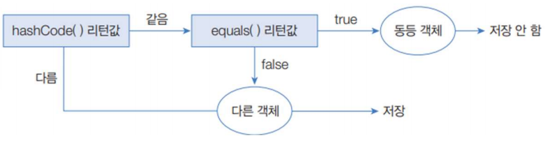 다른 객체라도 hashCode() 메소드의 리턴값이 같고, equals() 메소드가 true를 리턴하면 동일한 객체라고 판단하고 중복 저장하지 않음