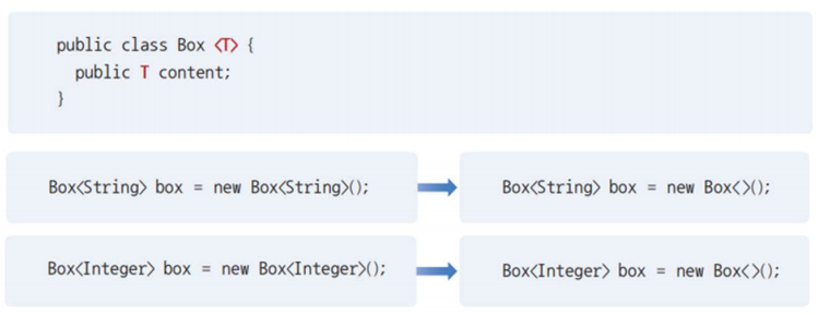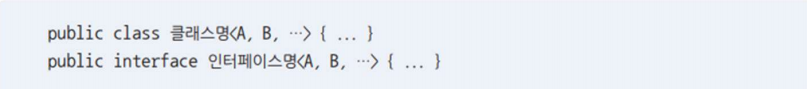 <T>는 T가 타입 파라미터임을 뜻하는 기호. 타입이 필요한 자리에 T를 사용할 수 있음을 알려줌