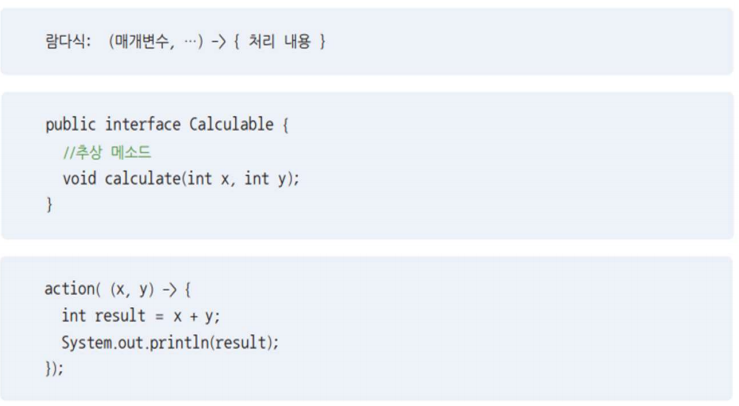 람다식: 데이터 처리부에 제공되는 함수 역할을 하는 매개변수를 가진 중괄호 블록이다.