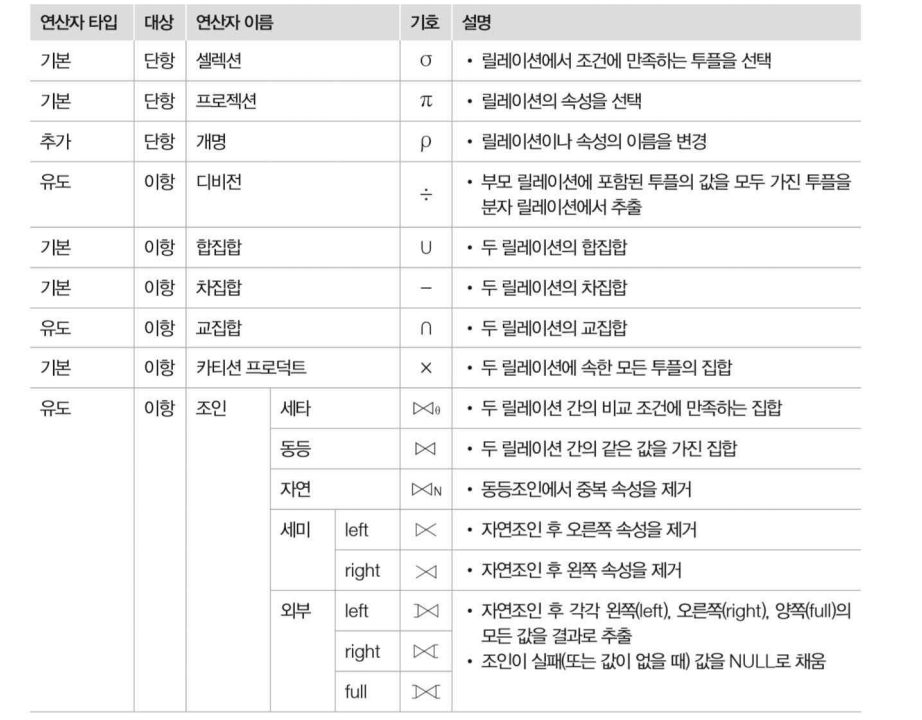 순수 관계연산: slelection(튜플단위), projection(컬럼단위), join, division, rename(개명)