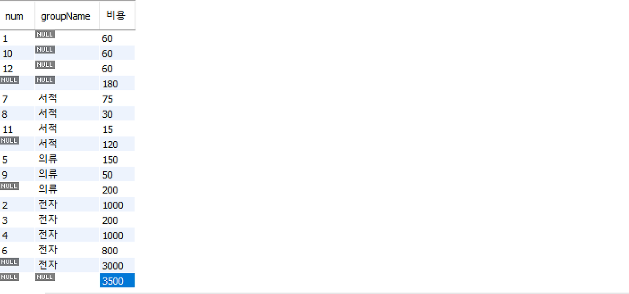select num, groupName, SUM(price * amount) as 비용 from buytbl group by groupName,num with rollup;