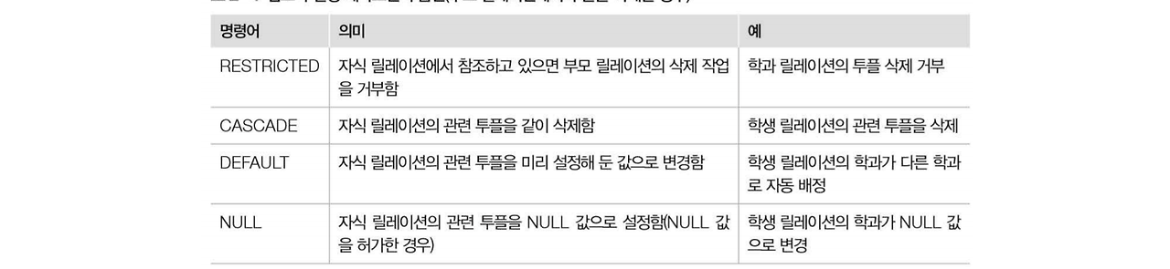 ※ 부모 릴레이션에서 투플을 삭제할 경우 참조 무결성 조건을 수행하기 위한 고려사항