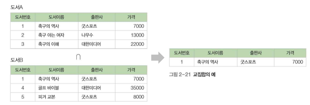 합병가능한 두 릴레이션을 대상으로 하며, 두 릴레이션이 공통으로 가지고 있는 투플을 반환함. n 형식 : R ∩ S