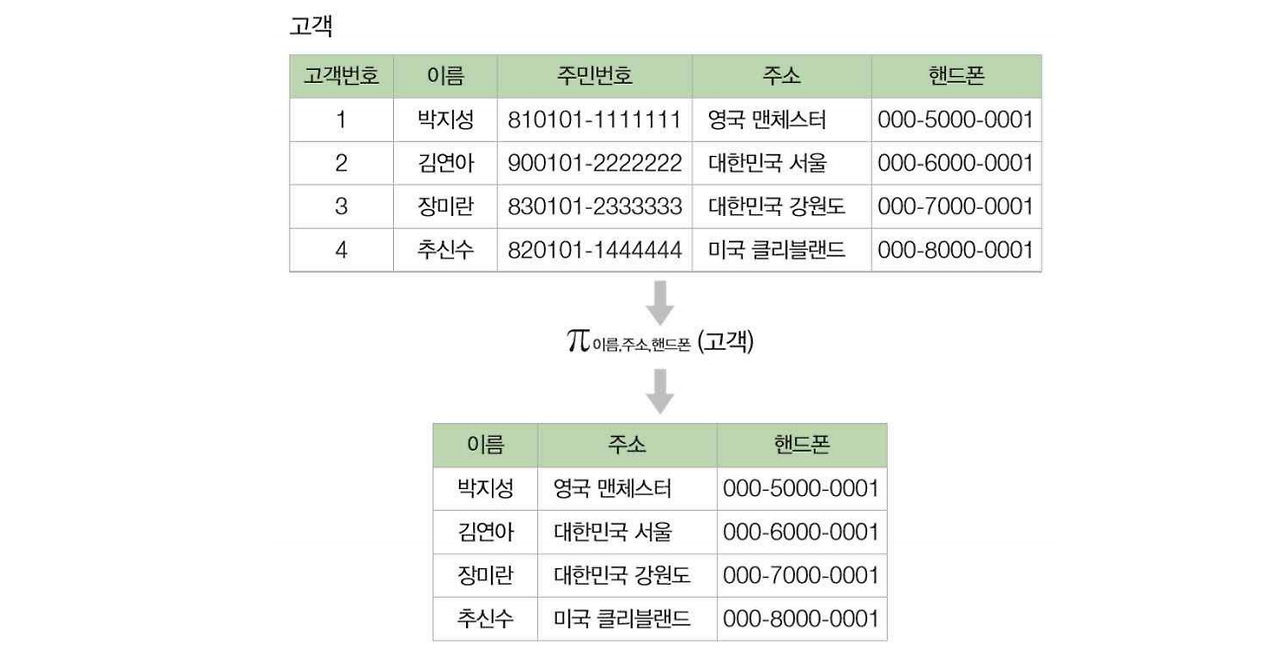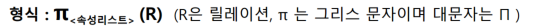 릴레이션의 속성을 추출하기 위한 연산으로 단항 연산자임. n 형식 : π<속성리스트> (R)