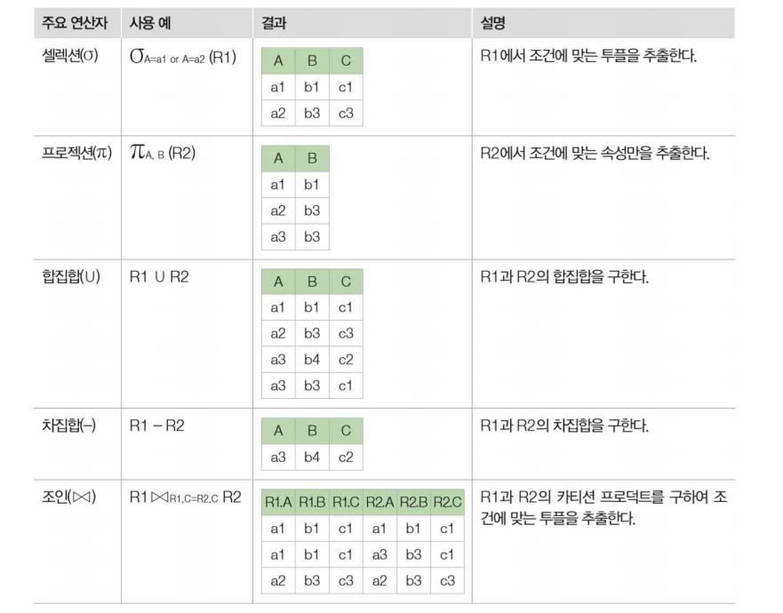 관계대수 : 어떤 데이터를 어떻게 찾는지에 대한 처리 절차를 명시하는 절차적인 언어이며, DBMS 내부의 처리 언어로 사용됨, 연산(오퍼레이션)을 이용해 질의