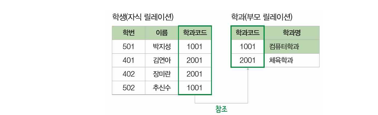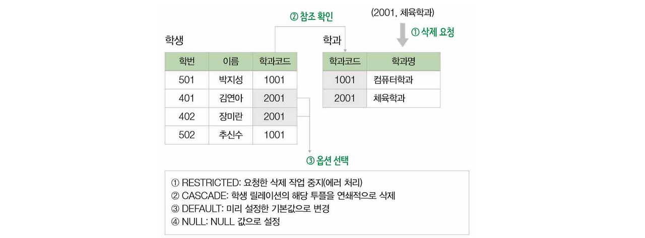 학과(부모 릴레이션) : 참조하는 테이블을 같이 삭제할 수 있어서 금지하거나 다른 추가 작업이 필요함.