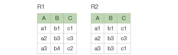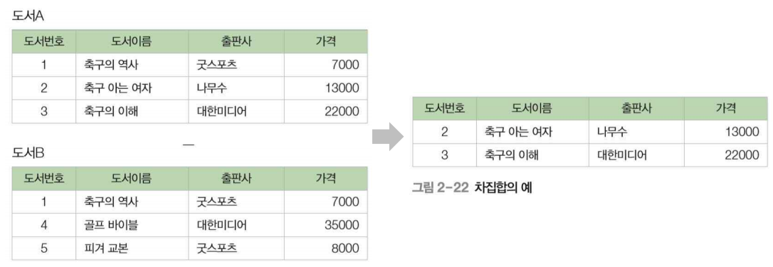 첫 번째 릴레이션에는 속하고 두 번째 릴레이션에는 속하지 않는 투플을 반환함.
