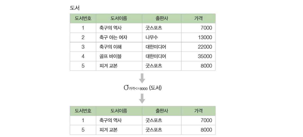 릴레이션의 투플을 추출하기 위한 연산임. 하나의 릴레이션을 대상으로 하는 단항 연산자며, 찾고자 하는 투플의 조건(predicate)을 명시하고 그 조건에 만족하는 투플을 반환함.