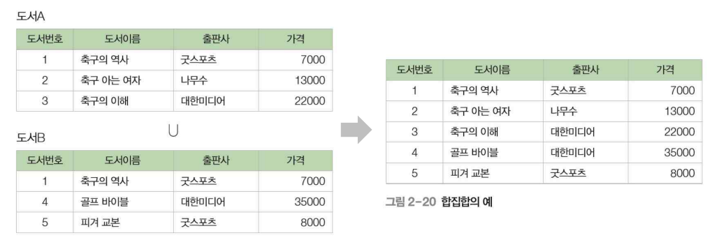 두 개의 릴레이션을 합하여 하나의 릴레이션을 반환함. 이 때 두 개의 릴레이션은 서로 같은 속성 순서와 도메인을 가져야 함.