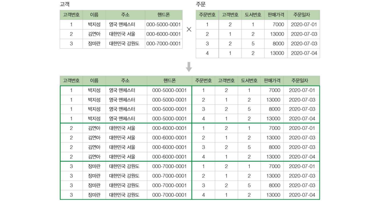 두 집합의 카티전 프로덕트 학번×과목은 학번 원소와 과목 원소의 순서쌍의 집합임. 즉, 학번×과목={(2, 데이터베이스), (2, 자료구조), (2, 프로그래밍), (4, 데이터베이스), (4, 자료구조), (4, 프로그래밍)}을 말함.