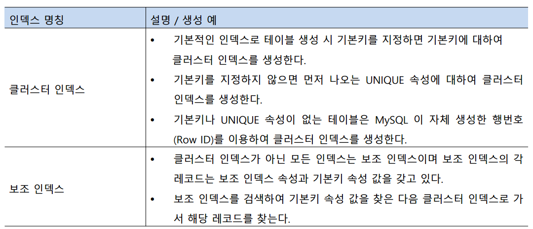 인덱스(index, 색인) : 도서의 색인이나 사전과 같이 데이터를 쉽고 빠르게 찾을 수