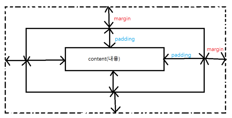 콘텐츠를 기본으로 보더(border)까지 공간을 패딩이라 하며 보더부터 점선까지 마진(margin)이라고 한다