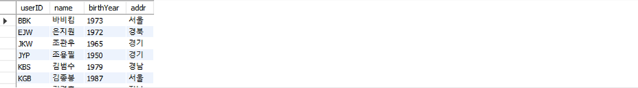 create table usertbl2(userID CHAR(8) primary key, name varchar(10) not null, birthYear integer, addr varchar(40));