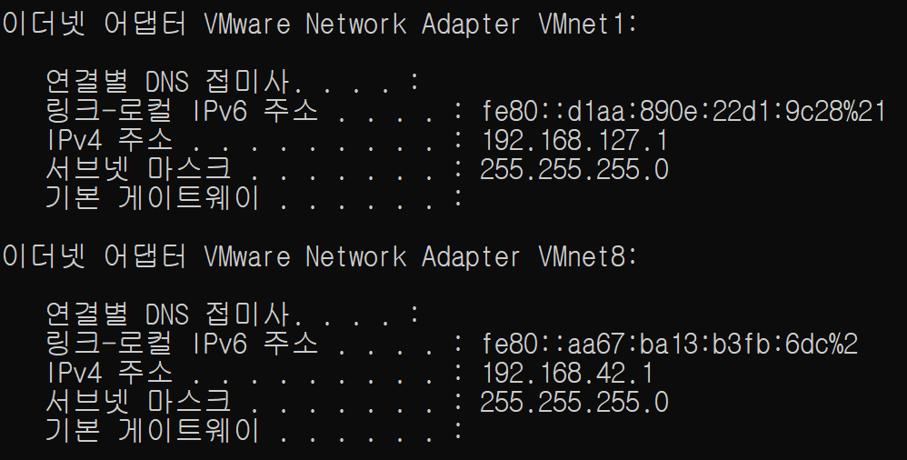 ipconfig 명령 실행 후 아래로 스크롤하여 ‘VMnet8’ 부분 확인