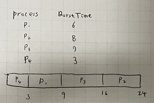 CPU가 이용 가능해지면, 가장 작은 다음 CPU 버스트를 가진 프로세스에게 할당
