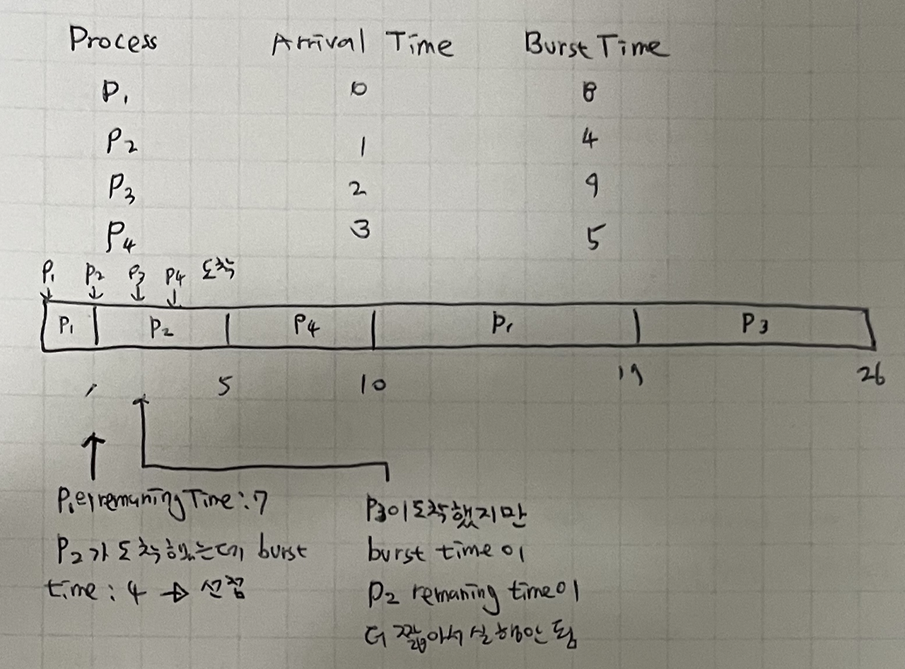 새로 도착한 프로세스가 현재 프로세스의 remaining time보다 적으면 선점시켜서 쫓아내겠다.
