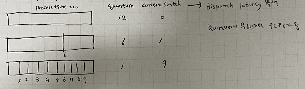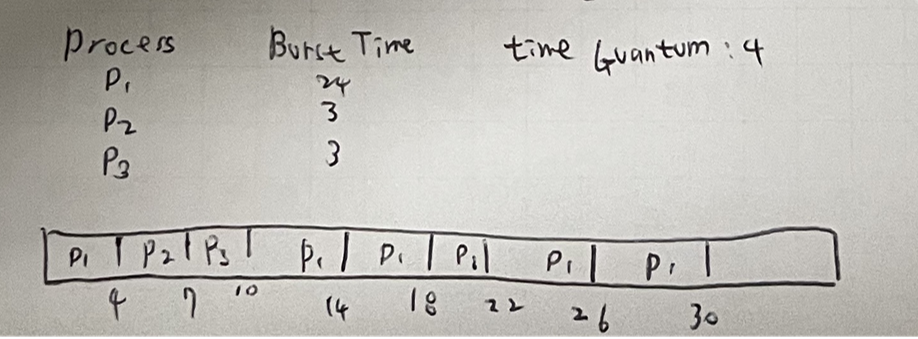 quantom보다 더 긴 CPU burst time 을 갖고 있으면 interrupt를 걸어준다 -> context switch -> ready queue