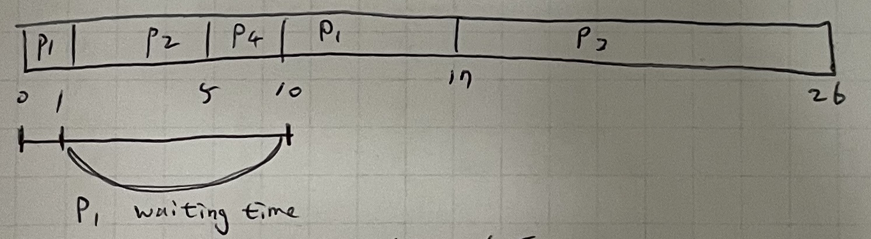 total waiting time: [(10-1)+(1-1)+(17-2)+(5-3)]= 26