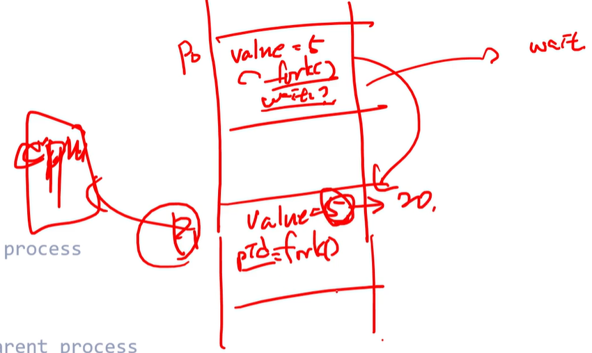 자식낳고 wait() 해주면 wait큐로 가서 child가 끝났을때 inturrupt 걸어주기를 기다림 -> child terminated 될때까지 기다림