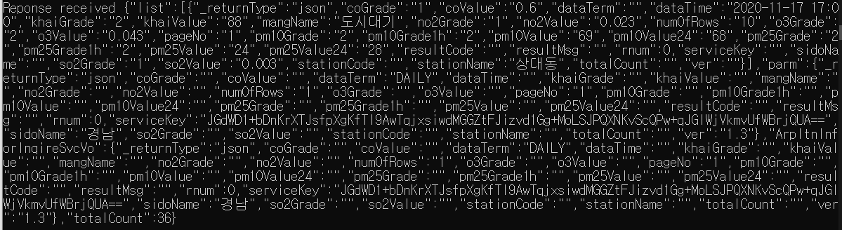 위와 같이 데이터 측정 시간과 미세먼지농도, 초미세먼지 농도가 출력 된다.