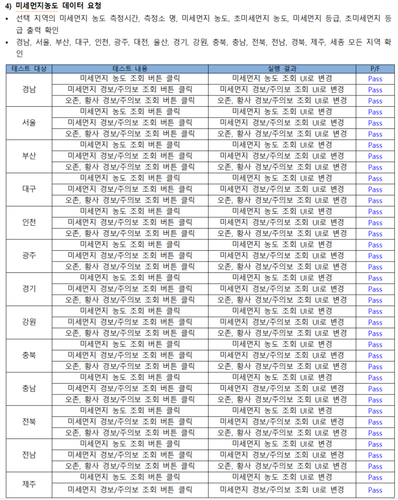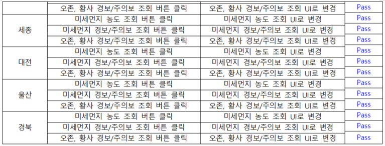 첫 UI의 '전국 지역'과 마지막의 '정보 출력'과 크게 다를 점이 없을 것으로 사료되어 기존의 "전국 미세먼지 경보 -> 정보 선택 -> 지역 선택 -> 정보 출력“에서 지역 선택 -> 정보 선택 -> 정보 출력 " 순으로 수정하였다.