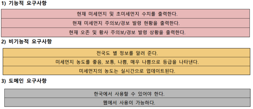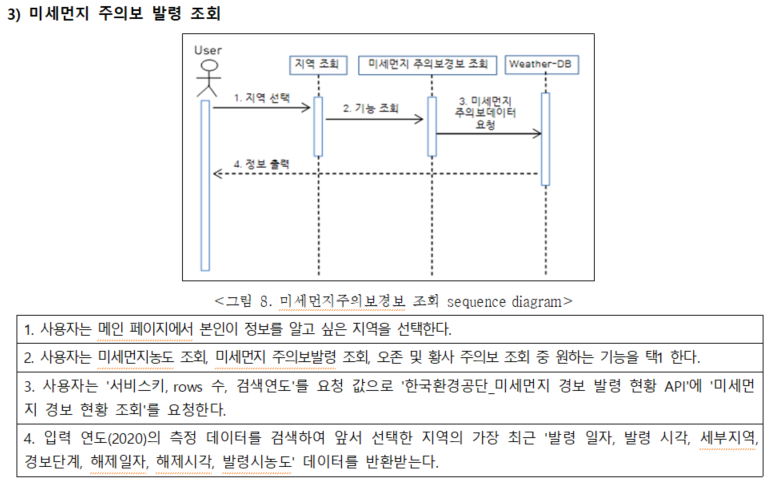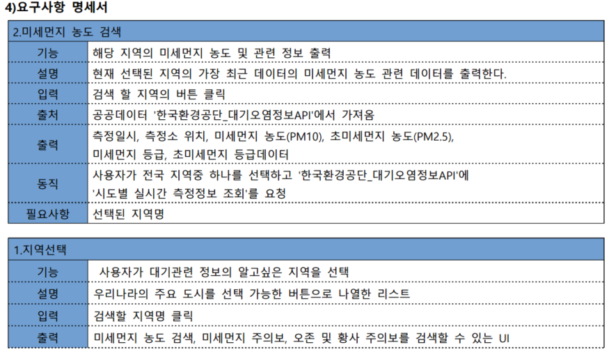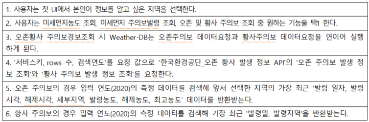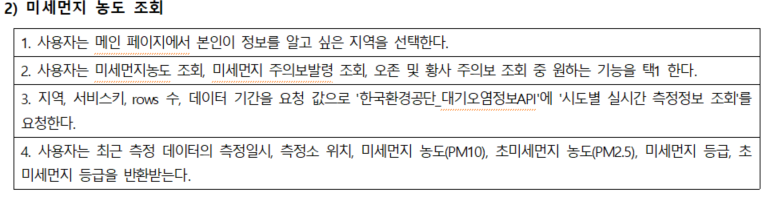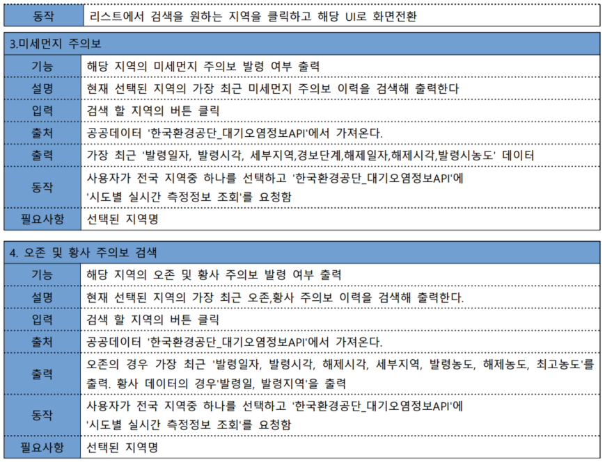 사용자는 실시간으로 알고싶은 지역의 미세먼지농도, 초미세먼지 농도, 주의보/발령 현황, 오존 및 황사 주의보/경보 발령 현황을 알 수 있어야한다.