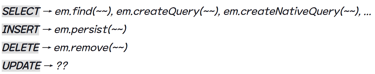 JPQL은 기본적으로 SQL을 추상화한 쿼리 언어이므로 SQL에서 제공해주는 DML(INSERT, UPDATE, SELECT, DELETE)을 EntityManager를 활용해서 사용할 수 있다.