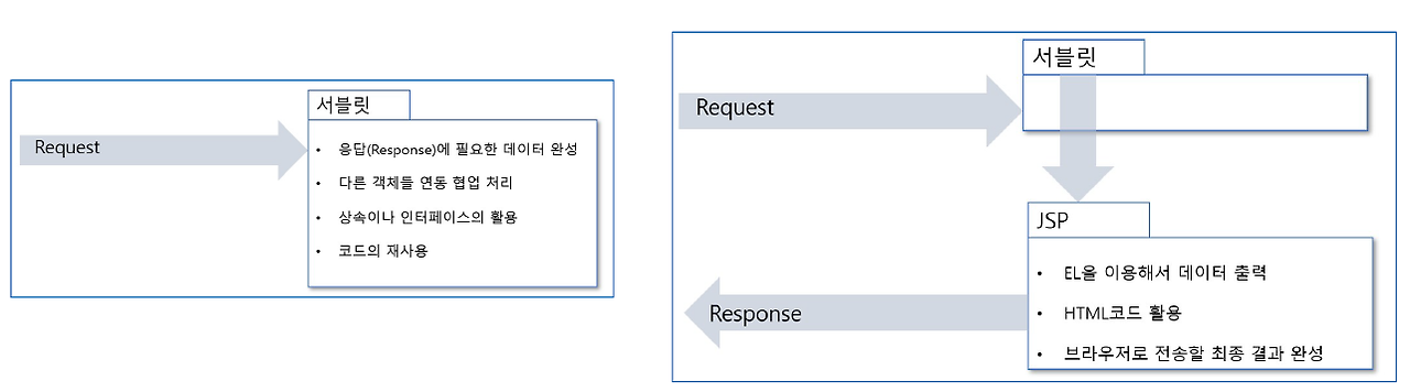 Request를 처리하는 Controller는 서블릿으로 화면은 JSP로