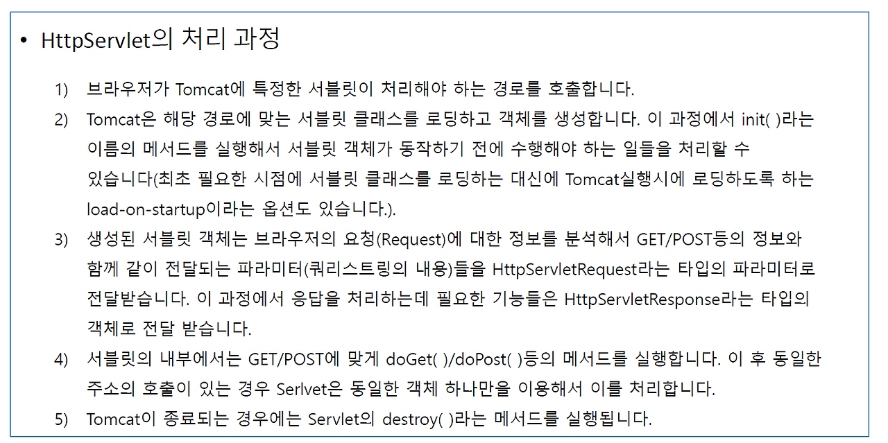 HttpServlet을 상속받은 클래스의 객체는 Tomcat과 같은 WAS의 내부에서 자동으로 객체를 생성되고, 관리되기 때문에 개발자가 객체의 관리에 신경 쓸 필요가 없다