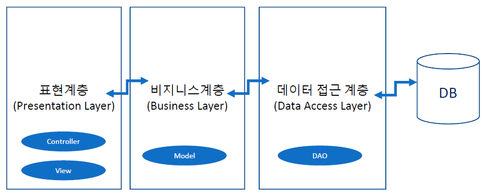 표현 계층: 실제 화면 처리를 담당하는 객체들로 이루어진 계층으로 앱의 화면이나 GUI화면의 화면들, 웹 MVC등이 이에 해당