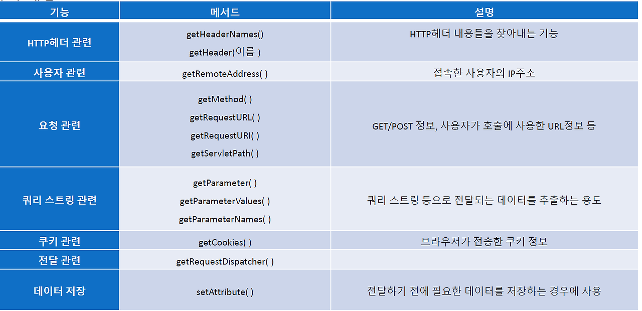 HttpServletRequest는 HTTP 메시지의 형태로 들어오는 요청(Request)에 대한 정보를 파악하기 위해서 제공