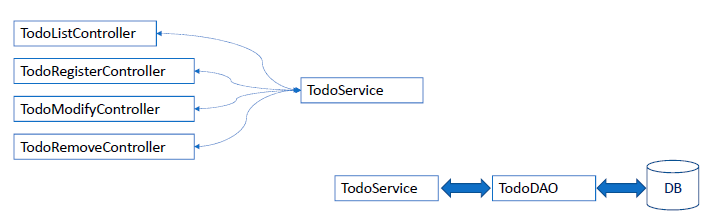 하나의 서비스객체에 연동해서 , 여러 컨트롤러로, 등록, 수정, 삭제 .. 묶어서 하나의 서비스 구현