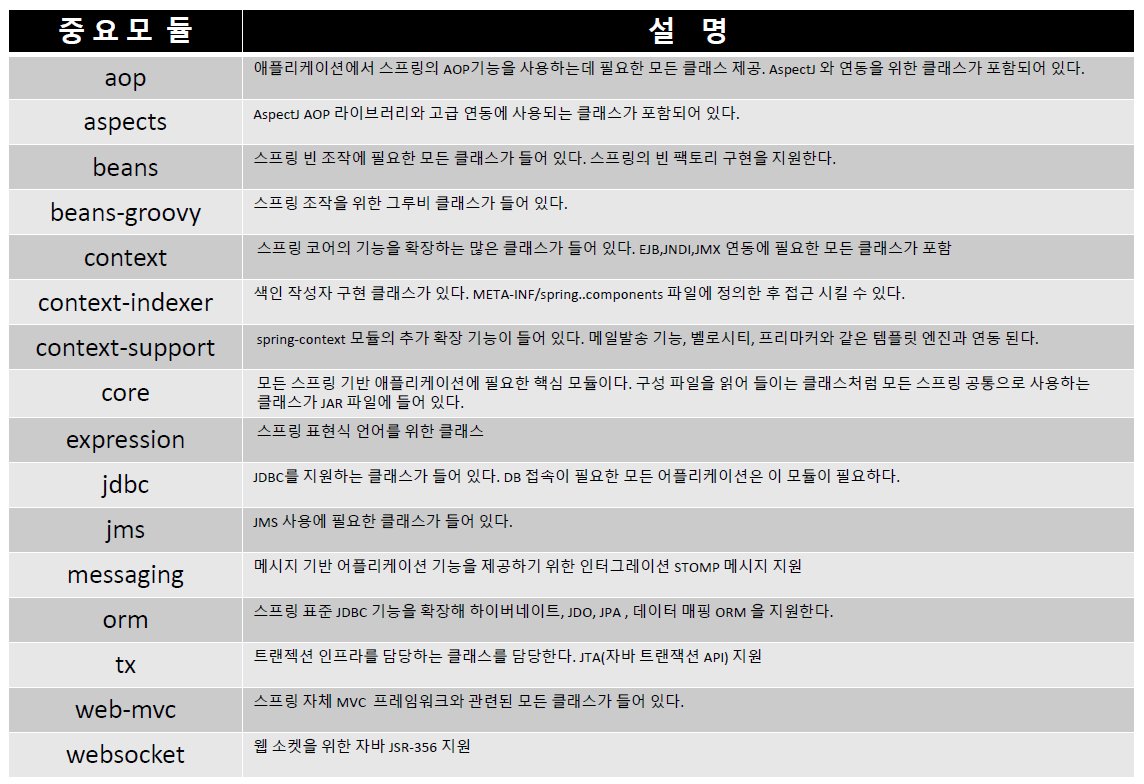 스프링 모듈이란 해당 모듈에 필요한 코드를 모아 놓은 JAR 파일