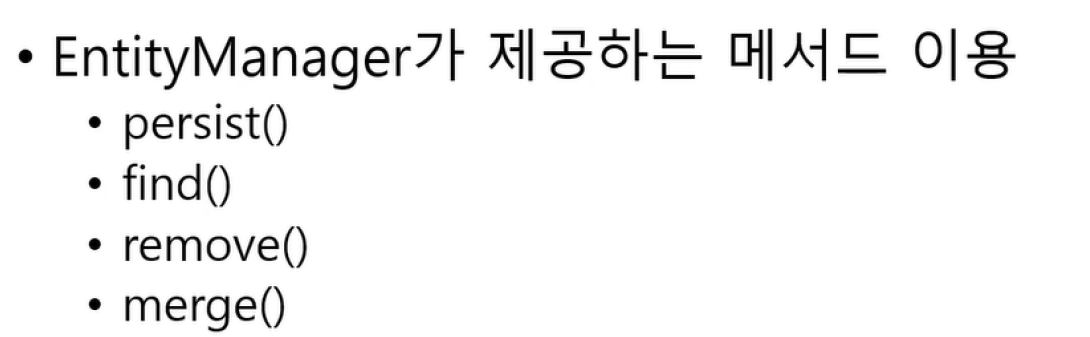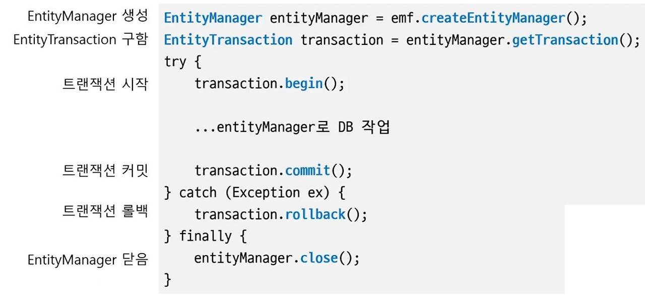 DB 작업이 필요할 때마다 EntityManager 생성 , EntityManager로 DB조작 , EntityTransaction으로 트랜잭션 관리