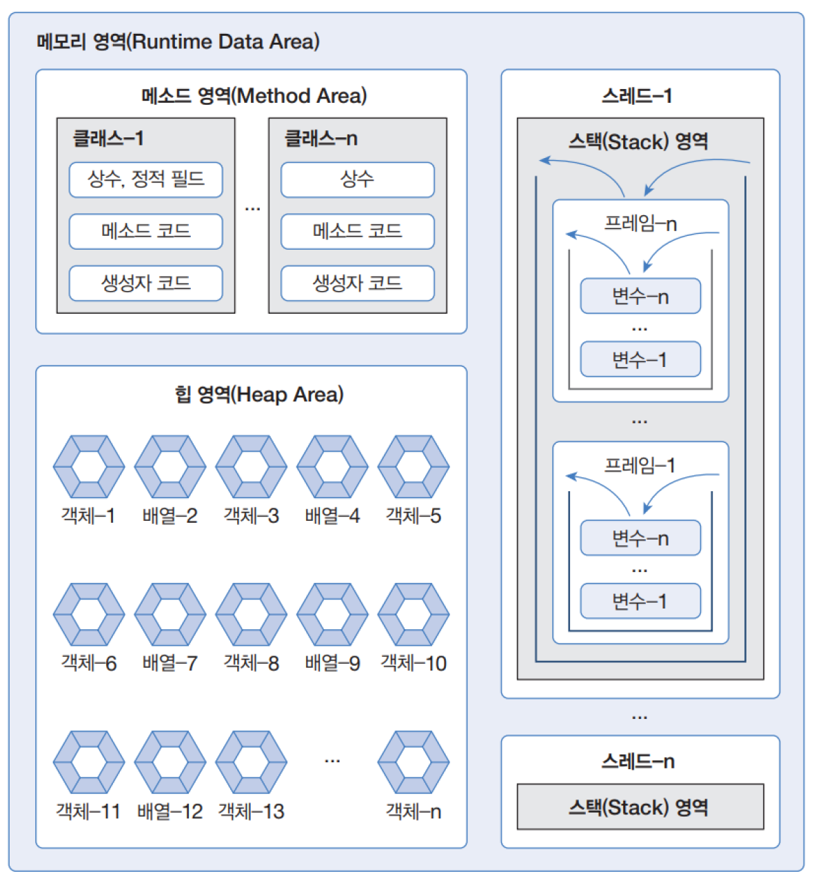JVM은 운영체제에서 할당받은 메모리 영역을 메소드 영역, 힙영역, 스택영역으로 구분해서 사용한다.